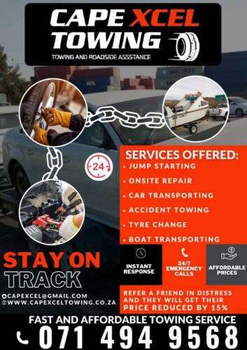 Cape Xcel Towing Cape Town - Towing services 24/7 365 days we go anywhere anytime local and long distance towing. Roadside assistance Cape Town we do repairs and fitting of door glass and Windscreens. We are mobile Mack's if we can't fix the vehicle on the spot we advise you to tow it to your place or ours